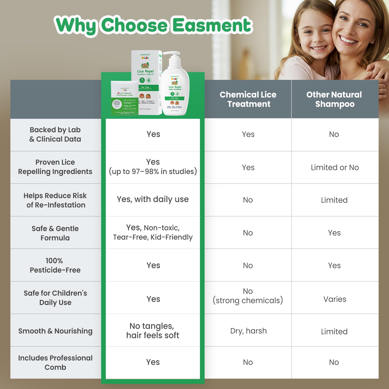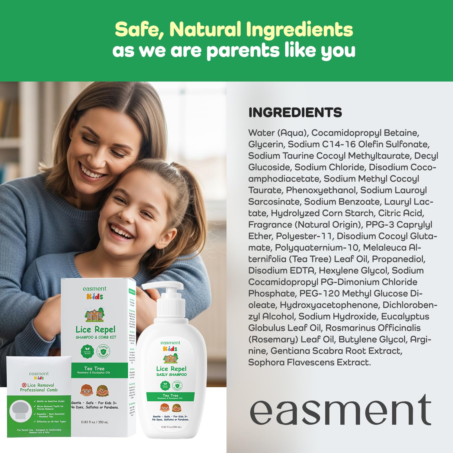 - Complete Kids Kit with Shampoo and Comb: Easment kids daily shampoo works together with a durable stainless-steel comb to support a gentle daily hair-care routine during lice season.